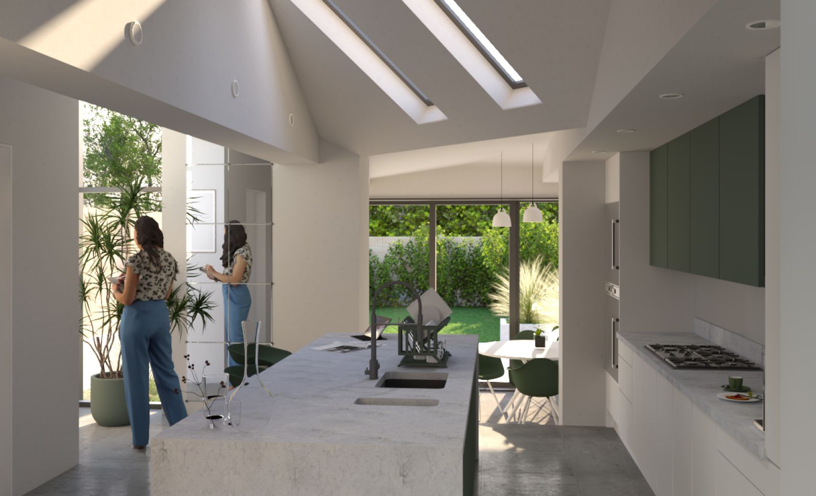 The Victoria Road project transforms a classic Victorian property into a modern family home. The open-plan living area and stylish kitchen create a spacious communal environment perfect for family gatherings. Thoughtfully designed bedrooms provide private retreats for each family member. The striking folded roof extension not only enhances the exterior aesthetics but also brings in abundant natural light. This blend of practicality and visual appeal creates a home that meets the needs of a large family while offering a contemporary lifestyle.